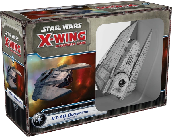 "The VT-49 Decimator is one of the Empire’s most feared warships, often used to provide long-range reconnaissance or deploy raiding parties behind enemy forces. The VT-49 Decimator Expansion Pack brings this intimidating Imperial gunboat to X-Wing™ as a hulking, large-base ship that towers over smaller starfighters. One detailed and pre-painted VT-49 Decimator miniature comes with four ship cards and thirteen upgrade cards, including crew members like Mara Jade. You’ll also find a new mission, three obstacle tokens, a maneuver dial, and all requisite tokens."
